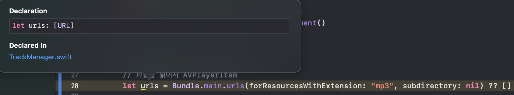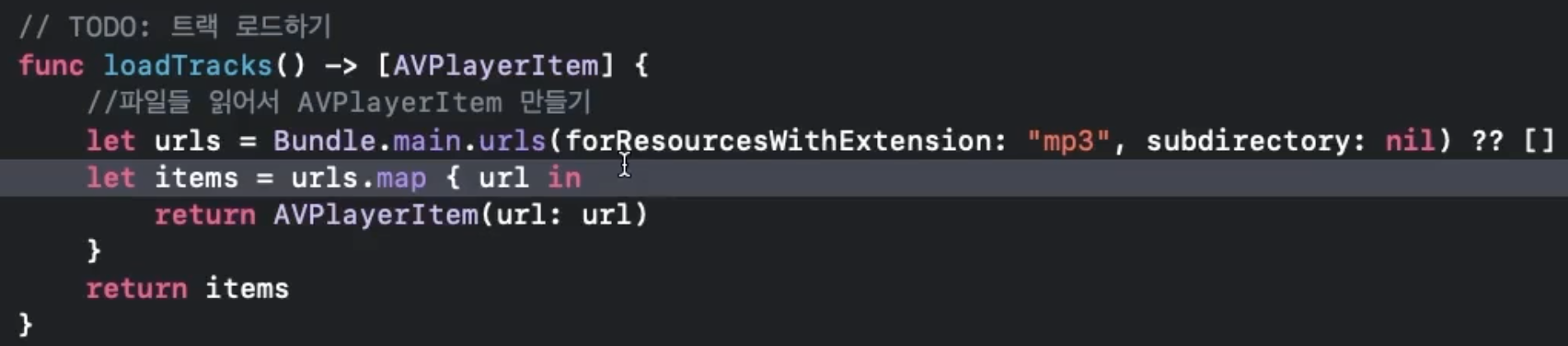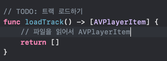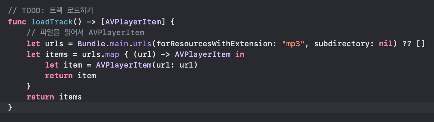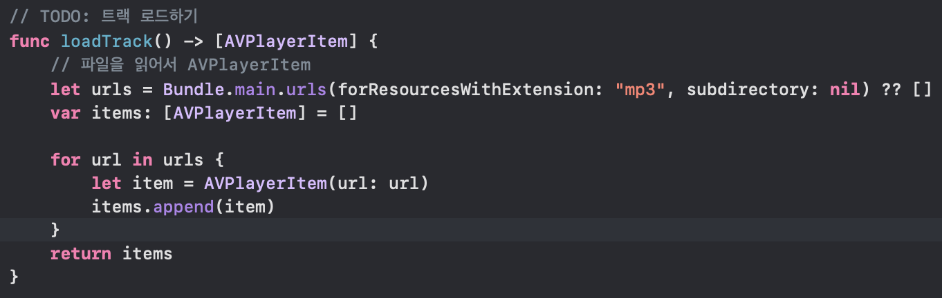 우리는 Resource 폴더에 존재하는 음악 파일들을 읽어와서 AVPlayerItem 객체로 다루며, 이를 array로 반환할 것이다.