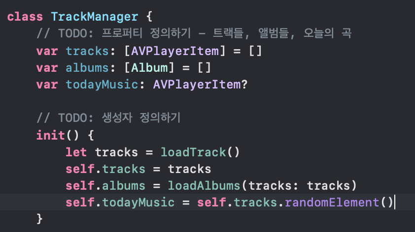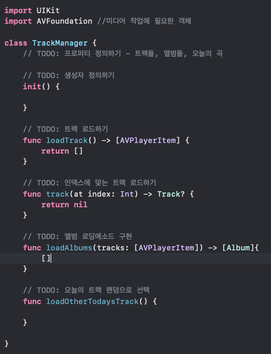 이제 TrackManager에서 Model을 정의하고, ViewModel의 메소드를 구현하겠다.