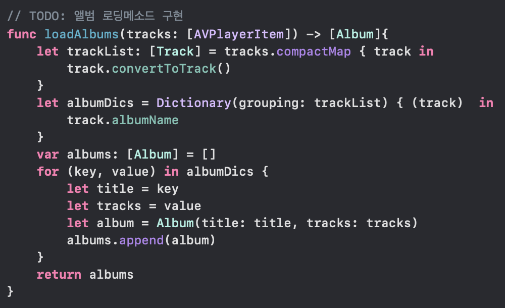 그렇기에 트랙을 주면 albumName을 기준으로 딕셔너리를 그룹핑하는 것이다.
