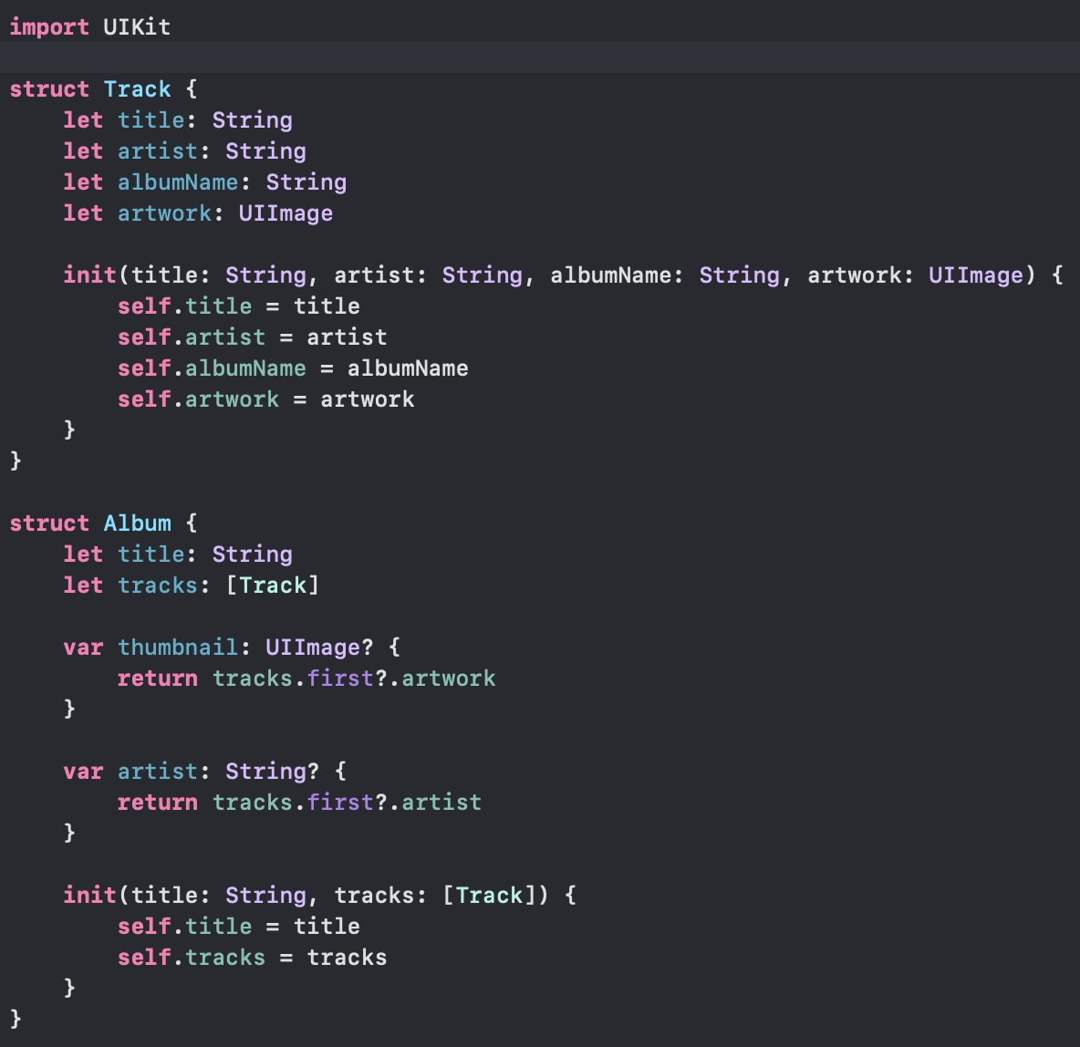 우리는 이제 Track이라는 Struct를 만들고 Track형 데이터와 View와의 중계자 역할인 ViewModel을 만들어 볼 것이다.
