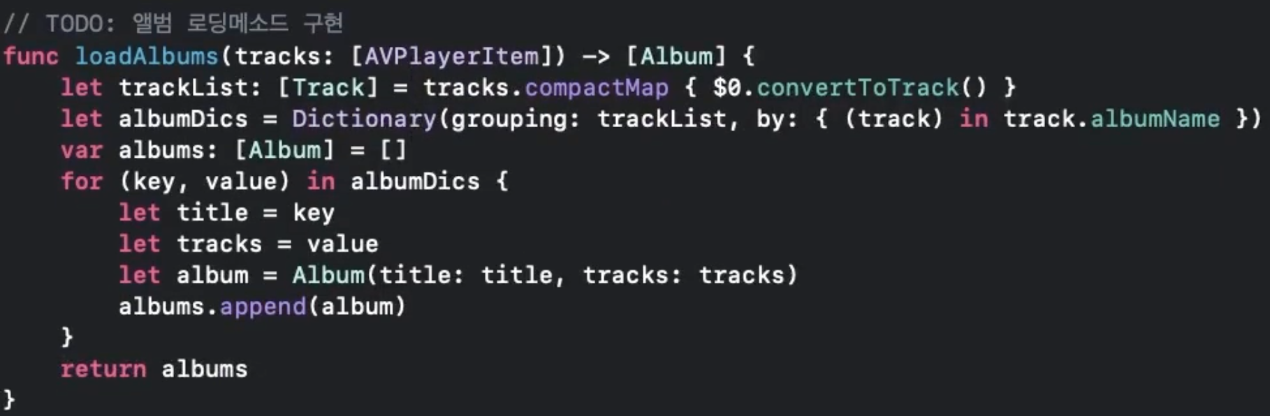가져온 track들을 갖고 albumName을 기준으로 뭉쳐모여를 해서 Album객체 array를 반환하는 함수를 만들었다. 여기서 closure 사용법을 다르게 적용한 점을 주의하자 (위에서는 소괄호 밖에, 아래에서는 소괄호 안에 클로져가 존재)