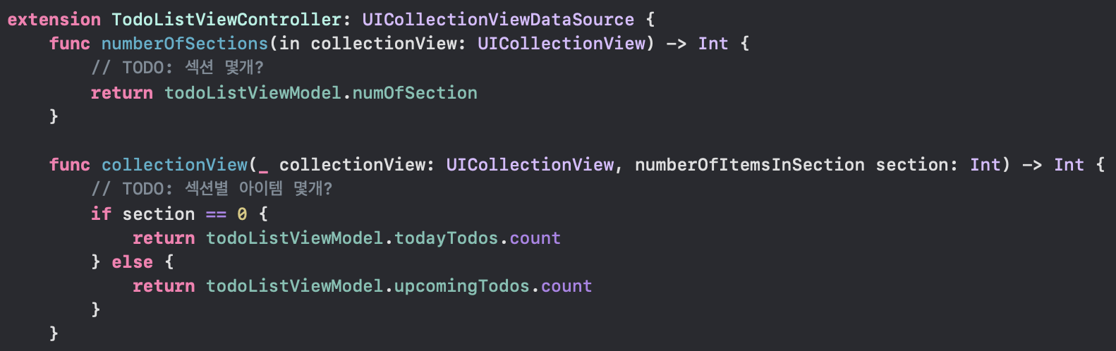 todoListViewModel.numOfSection을 반환하게 되면 현재 Section의 갯수는 2개가 존재한다.