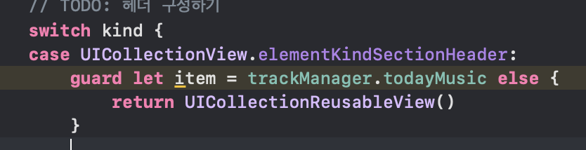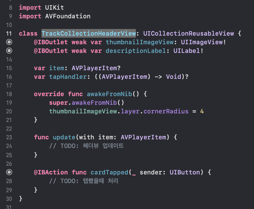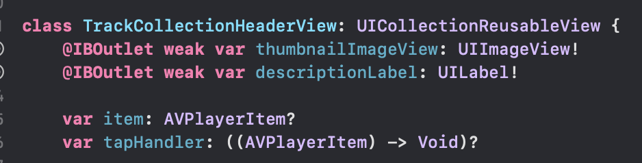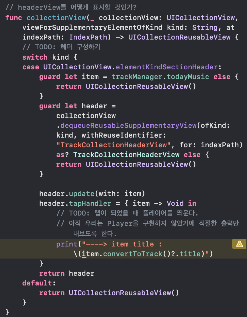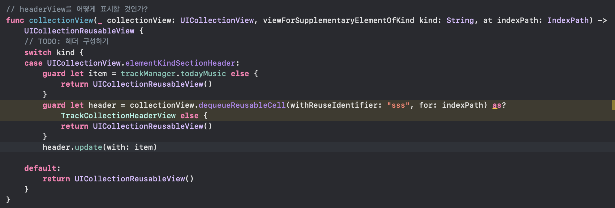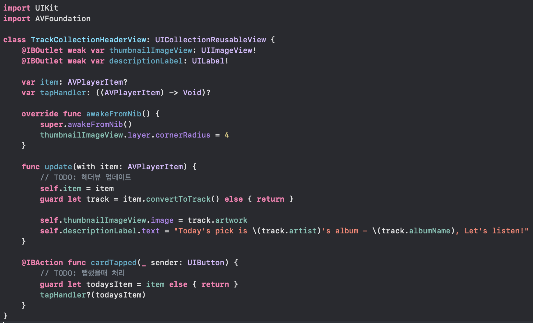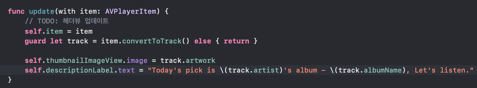 우리는 이제 item을 header에 업데이트 할 메소드를 header(TrackCollectionHeaderView)에 구현할 것이다.