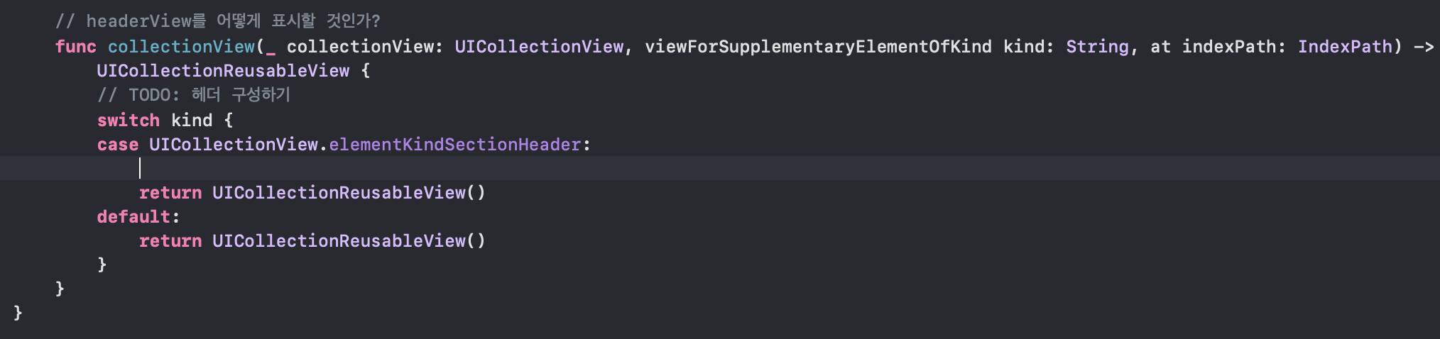 header에는 dequeueReusableSupplementaryView를 사용하며 dequeueReusableCell을 사용할 때와 유사하다.