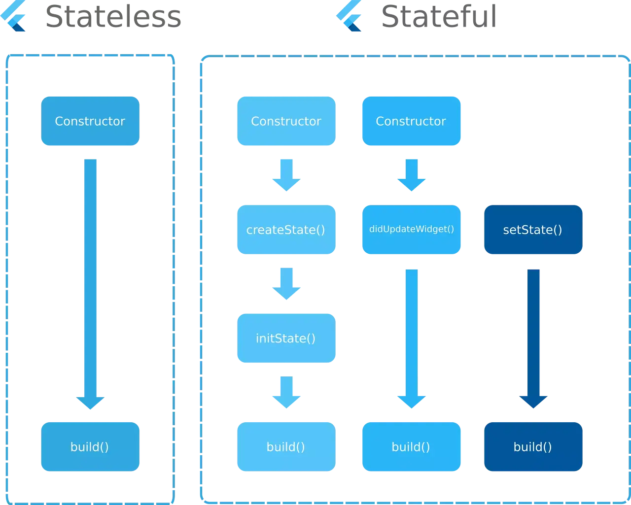 플러터에서 UI를 표현할 때 대표적인 위젯은 StatelessWidget과 StatefulWidget이 있습니다. 이 두 위젯의 Life Cycle를 통해 상태 관리에 대한 이해를 배워보겠습니다. 여기서 Life Cycle이란 생명주기를 뜻하며, 객체의 생성과 동작하는 것, 소멸할 때까지의 일련의 과정, 주기를 의미합니다. 아래는 StatelessWidget과 StatefulWidget의 Life Cycle입니다.