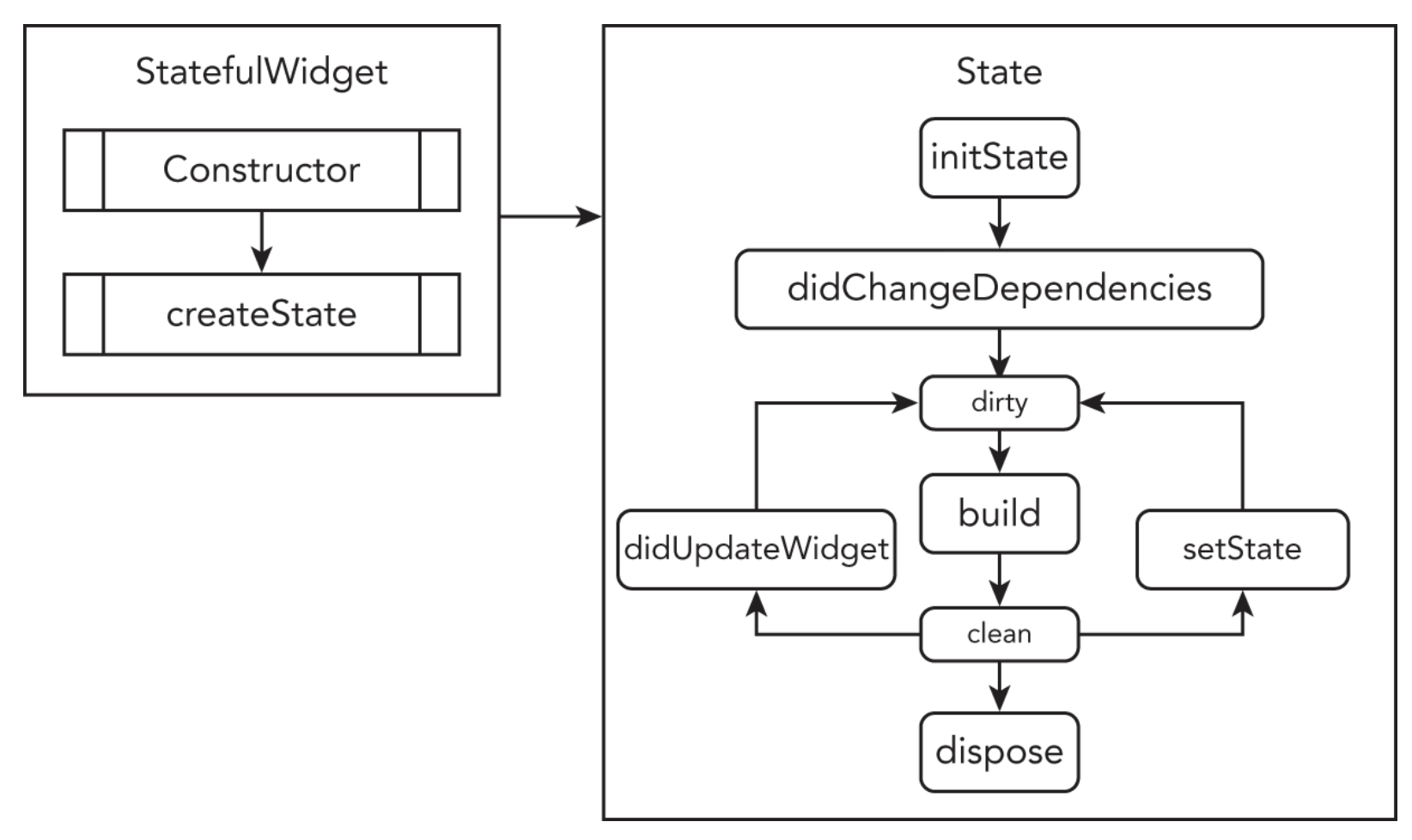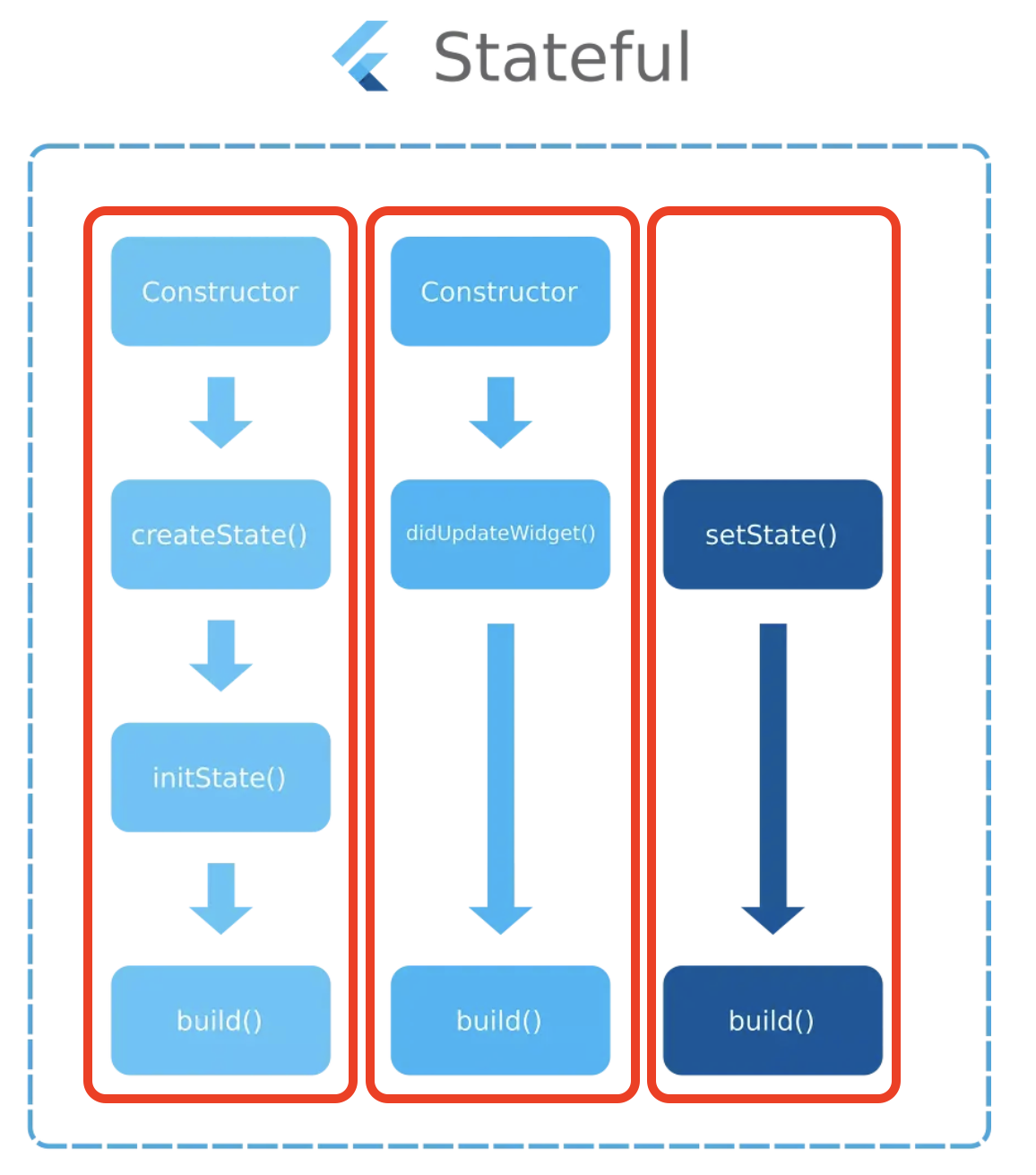 StatefulWidget은 StatelessWidget과 마찬가지로 외부에서 위젯 생성자의 매개변수를 변경해주면 위젯이 새롭게 생성되고 build() 함수가 실행되기까지 과정은 같습니다. 이 말은 혼란의 야기할 수 있기에 추가 설명을 하면 다음과 같습니다. StatefulWidget 또한 Widget을 상속받고 immutable한 속성을 그대로 갖습니다. 즉, StatefulWidget 생성 시 필요한 매개변수의 변화는 인스턴스 재생성이 필요함을 나타내며 Stateless와 똑같이 진행됩니다.