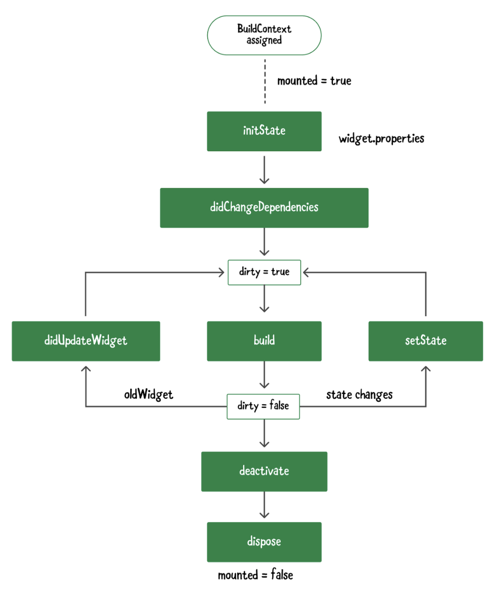제일 기본적인 상태이며 StatefulWidget이 생성되고 소멸되는 전반적인 과정이다.