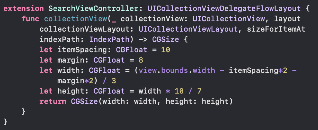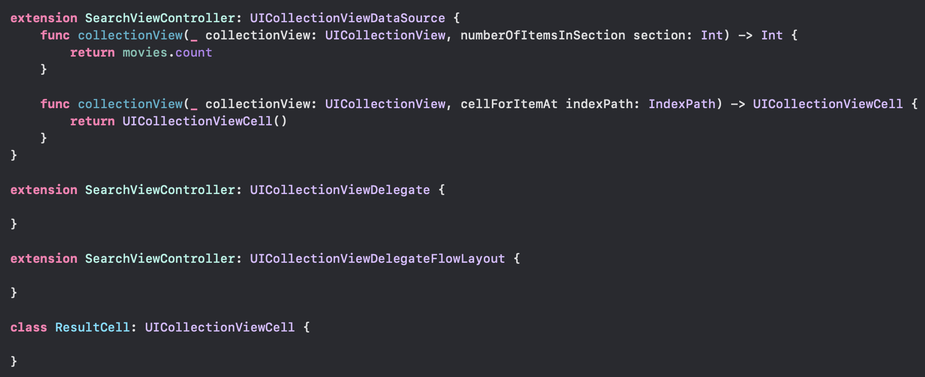 CollectionView와 SearchViewController의 DataSource, Delegate를 연결하고 다음과 같은 protocol을 구현하면 된다. UICollectionViewCell도 구현하고 id를 지정해준다.