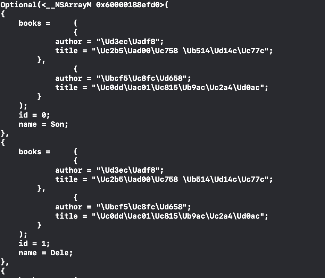 그리고 저장된 데이터를 Fetch를 해보니까 Array형태로 JSON이 내려온 것을 확인했기에 이를 JSON데이터 형식으로 바꾸어서 Codable을 이용해 우리가 원하는 형태로 Parsing을 해봤다.